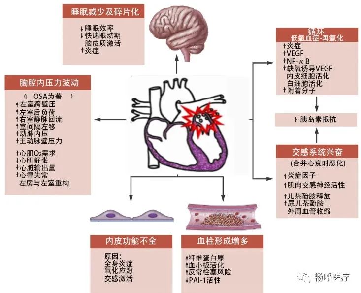 ①間斷低氧血癥及高碳酸血癥引起交感神經(jīng)活性增加,體內(nèi)腎素-血管緊張素Ⅱ-醛固酮系統(tǒng)激活,血漿兒茶酚胺水平升高,外周血管阻力加大從而導(dǎo)致高血壓。②OSAHS患者呼吸暫停低通氣指數(shù)升高、血氧飽和度降低,加速了血管內(nèi)皮細(xì)胞的凋亡,進(jìn)而損害血管內(nèi)皮依賴性舒血管物質(zhì)的功能,打破了舒血管物質(zhì)及縮血管物質(zhì)之間的平衡,引起血壓升高。③反復(fù)的缺氧激發(fā)了炎癥物質(zhì)的釋放以及氧化應(yīng)激的增強,使血管內(nèi)皮破壞增加。④慢性間歇性低氧血癥通過興奮交感神經(jīng),刺激多種激素分泌,引起血糖增高、胰島素抵抗,使胰島素調(diào)節(jié)血管內(nèi)皮的舒張功能減弱。⑤此外,還有胸腔內(nèi)負(fù)壓增高所導(dǎo)致的機(jī)械效應(yīng)、遺傳以及年齡等諸多因素。
